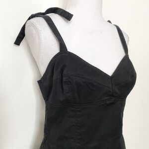 ARITZIA WILFRED BLACK TIE STRAP SWEETHEART FITTED MINI DRESS STYLE CBS4-80009-28, This is a mini dress with gathered cups, tie shoulder straps and a smocked back bodice. It's made with textured crepey fabric. The custom print is exclusive to the brand. A minimalist black sweetheart neckline sleeveless tied up straps mini fitted dress in a stretchy cotton denim - back concealed zippper fastening - pockets - not lined- has stretch - sheath large waistband seaming for a flattering touch for the silhouette. CAsual - 90's inspired - dark academia little black dress, wearable all year long yet spring and summer favorite.