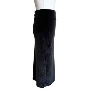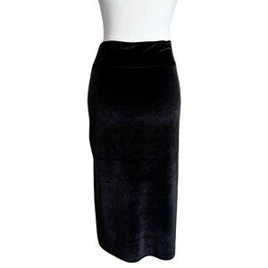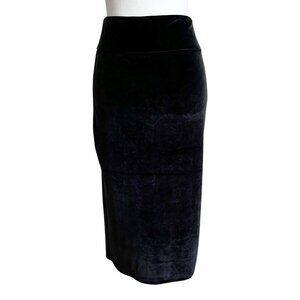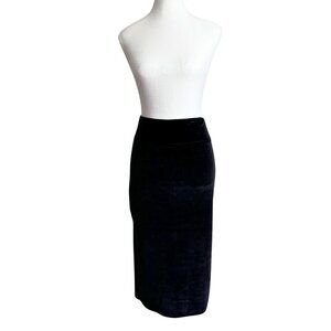 ARITZIA WILFRED BLACK VELVET MIDI SKIRT ARTICLE 57756, This is a super stretch high rise black velvelt / velour midi pencil skirt from Aritzia- pullon style - large extensible waistband for a comfy sheathing feature - unlined - favorite fall and winter day to night work / office / business / to date / clubbing /dinner skirt wiht a black satin or lace top - layer it with a black velvet blazer for a coordinated set.