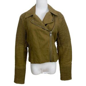 ARITZIA WILFRED FREE ALANA KHAKI GREEN LINEN BLEND MOTO JACKET ARTICLE 50660 STYLE NLV7-4150-14, Featuring intricate trapunto stitching in cuff hem and elbows this fully lined moto jacket is made from a textured linen and cotton fabric. Bold metal zippers add instant attitude to the design. Great condition, and is such an cool and unique piece. This jacket marries the best of both a Utility Jacket and a Moto jacket in a short length - front full zip - stand up neckline or left open for a collared look - not stretch - wide pleated wavy ribbing panel - zipped pockest - mix of a grunge coastal urban jacket - perfect fall transitory jacket for a layered look.