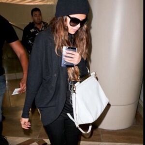 This is a cocoon sweater with ribbed sleeves and pyramid stud details. It's made with a brushed fabric that's super soft.