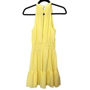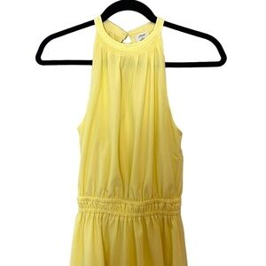 This is a sleeveless mini dress with a cinched waist, a halter neckline and a flounce hem. It's made with a luxe, drapey crepe de chine.