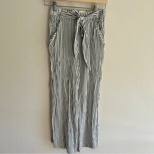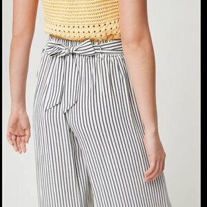 You'll be wearing these guys a lot. These are high-waisted, wide-leg pants with a subtle flare and an adjustable self-tie at the waist. They're cut from yarn-dyed striped fabric. This version is cut to hit at the ankle.