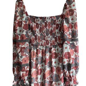 Aritzia Wilfred Peasant Style Midi Grace Dress in a gorgeous 70's inspired fall coloured floral print. Featuring an empire waist smocked bodice, long billowy shear sleeves with lace trim and a ruffled hem skirt, this dress is sure to become one of your favourite closet staples. This is a versatile piece that can be worn to a variety of occasions. It is ideal for formal events such as bridal shower, luncheons, garden parties, as well as more casual events such as dinners or cocktail parties. The dress can be paired with heels and a clutch for a classic and elegant look, or with statement jewelry and bold accessories for a more contemporary look. Dress it down with cowboy boots to rock the coastal cowboy aesthetic.