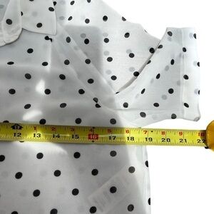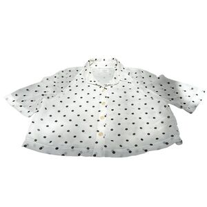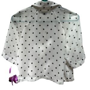 In excellent pre-owned condition, short sleeved, crop style, white lined with black polka dots. Size x-small, front button up, please go by measurements. Viscose/Rayon