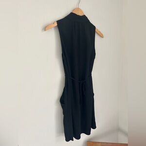 This is a sleeveless dress with a faux-wrap front and self-tie detail at the waist. It's made with a Japanese fabric that drapes nicely.