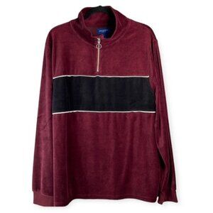 Mens 80’s retro vibe burgundy and black with white piping trim Arizona Jean Co Pullover 1/4 zip long sleeve sweater.