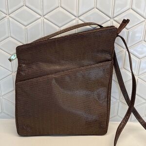 Arnold Churgin crossbody bag with an asymmetric design that has a front pocket with a snap closure and a zipper compartment with another interior zipper compartment. Mid-brown colour with a tweed pattern and a patent-like shiny finish. The pictures that represent the colour of the bag most accurately are those styled with the grey jacket. This bag is big enough to hold all of your essentials and cross body design keeps your hands free. No material tag, I would say faux leather and a fabric lining.