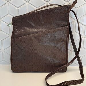 ARNOLD CHURGIN Brown Faux Leather Asymmetric Cross Body Bag Tweed Pattern