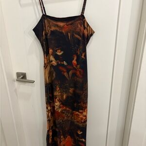 Statement-making SHEIN slip dress featuring a stunning classical art–inspired print in rich, moody tones. This dress has a sleek, body-skimming silhouette with adjustable spaghetti straps and a soft, very stretchy fabric that moves comfortably with you.