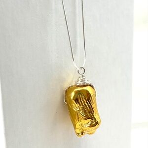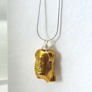 Beauty in nature and Artisan Creativity, this is a Handcrafted Pendant made from a natural coral shaped stone, overlaid with Gold Vermeil, Hand-wrapped with .925 Sterling Silver Wire, and suspended on a 24” .925 Sterling Silver Italian made Snake style chain. Pendant is approximately .75” in width and 1.5” in length. Necklace weighs approximately 18grams. This Designer has been creating quality Jewellery for over 20 years, and one of his favourite things is to Hand-Wrap beautiful stones with .925 Sterling Silver Wire! Handmade in Atlantic Canada. New. Retail Price $140. 🤩