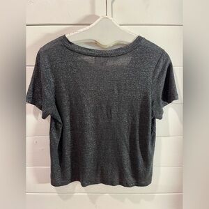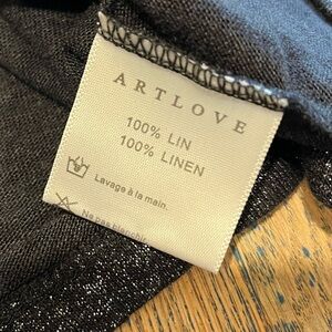 T-shirt noir à manches courtes en lin mélangé de la marque Artlove Paris. Coupe droite, encolure en V, tissu léger au fini subtilement brillant. Détail à noter : le brillant est légèrement estompé sous une aisselle (voir photo). Sinon en très bon état.