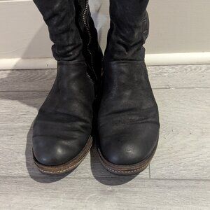 Worn, but good condition. Size 37. Side zipper closure. Metal studs and red leather accents.