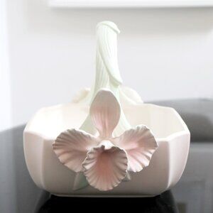 A lovely satin matte finish ceramic planter with detailed pink iris flowers on each side, with a leafy baåsket handle. Sadly there is damage to this piece - see photos for details.
