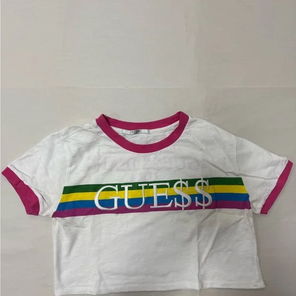 Short-sleeve GUESS tee in white. Pink ribbed collar and sleeve cuffs. Horizontal rainbow stripe across chest with bold GUESS logo. Lightweight cotton look for casual wear.