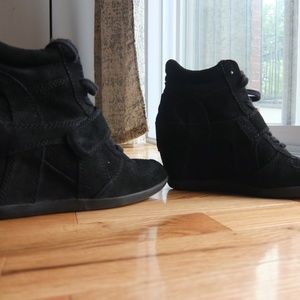Ash Footwear Bowie Wedge Sneaker in 100% suede leather with fabric detail. Comfortable, stylish, versatile. Lace-up sneakers with elastic closure. Rubber sole. **Pre-owned, lightly worn, in mint condition.**