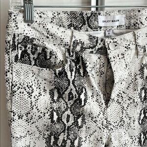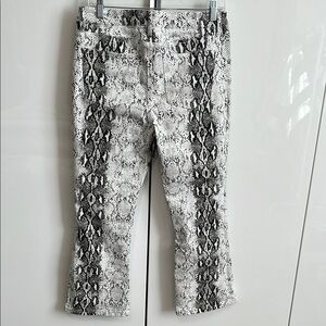 Stylish snakeskin print denim jeans with a 5 pocket design, flared cropped leg and mid rise. Snake print in black and white, cotton elastane stretchy blend for the perfect fit. Machine wash. Perfect for a bold look. I have a snake print denim jacket in my closet for sale that is a match. Bundle and save 🛍️