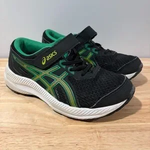 ASICS Running Shoes Kids' Contend 8 PS Black Lime Zest Size 1 Excellent used condition. Indoor shoes only.