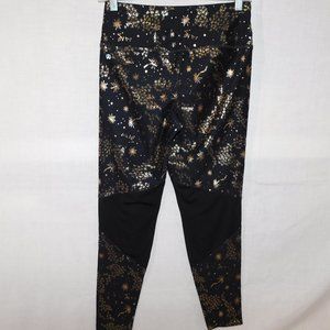 This Pair of Women's Small ASKYA Black with Gold Constellations Workout / Activewear Crop Leggings are in great clean condition.  Leggings are 87% Nylon - 13% Elastane - Machine washable.  These soft Leggings feature gold / bronze metallic star / space / constellation images throughout has mesh cutout that hits near knee and is a small triangle on the front and larger area on back of knee - see all photos. Has key pocket on inside waist band.
