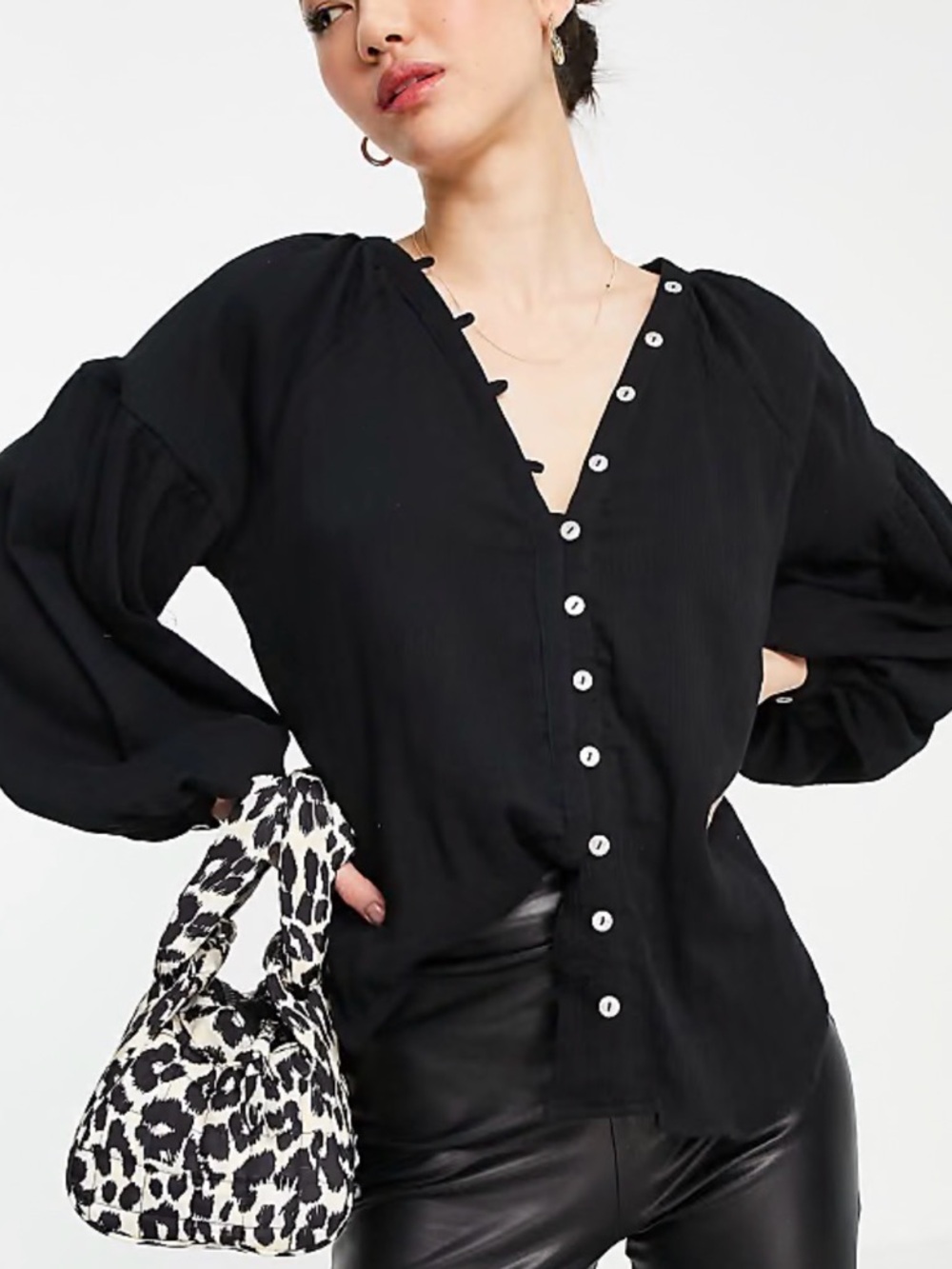 ASOS Design, 100% cotton, Lightweight black blouse with V-neck and shell button-front detail. Long puff sleeves and relaxed fit for a historical feel.