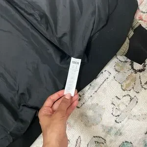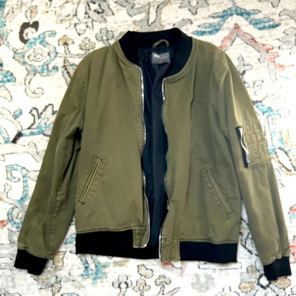 Elevate your everyday casual style with this versatile olive bomber jacket from ASOS. The size XXL (fits more like a US L) can be worn by both men and women for an oversized look or to layer over a thick wool jumper. The jacket features a classic design with ribbed cuffs and hem, complemented by a sleek black inner lining. It has convenient pockets, including a zippered arm pocket, adding both functionality and flair. The outer layer has a bit of natural fading that enhances its appeal, giving it a unique charm while still being in good condition. Perfect for layering in cooler weather, this jacket effortlessly combines practicality with style.