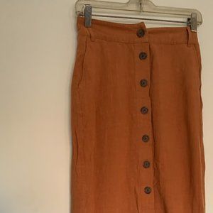 Size is US 4. Great skirt for spring, summer, and fall! Color is written as "Saddle up brown", but it's a natural orange, almost terracotta color.