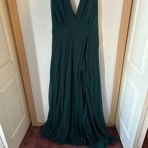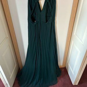 Elegant deep green dress. Features a V-neck and crisscross back. Perfect for a formal event. Beautiful details & slit up the leg!