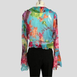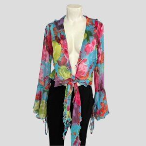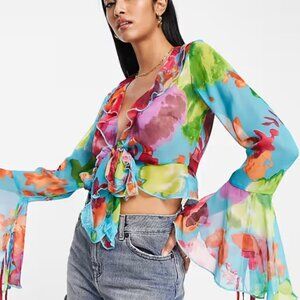 ASOS Design Tie Front Sheer Blouse With Frill Neck In Blue Bright Floral