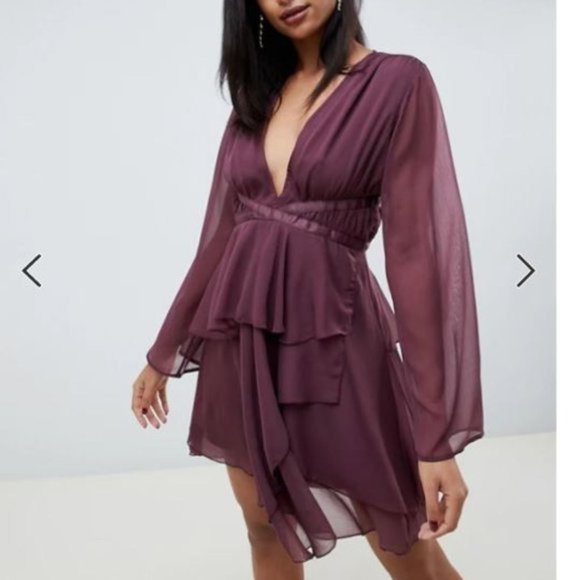 ASOS DESIGN soft mini dress with sheer long sleeves, deep v-neckline, waist detail, and layered bottom.