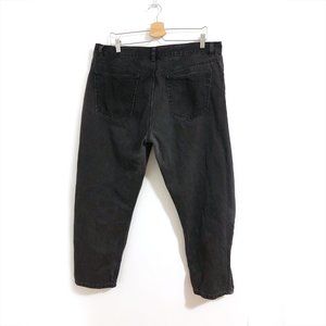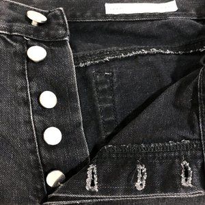 Mid Rise black plus size ASOS mom jeans. Mid Rise, 100% Cotton, button fly. Tag reads W 36 L32. Some distressing in inner thighs, but lots of life left in these guys!