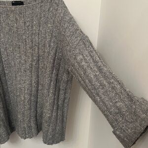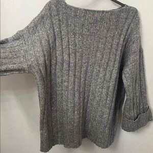 Soft chunky ribbed knit sweater with a boat neck cut. Long wide, cuffed sleeves with subtle dropped shoulders. Cozy yet lightweight for layering.
