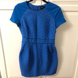 This Blue Jacquard Tulip Dress is fitted on top and loose on the bottom.