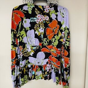 Bold floral blouse with vibrant colors. Features a mix of black, green, purple, and orange. Perfect for a stylish look.