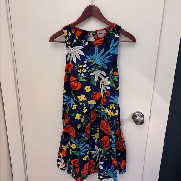 Sleeveless ASOS dress with a floral pattern. Features red, blue, and green colors. Unique back!