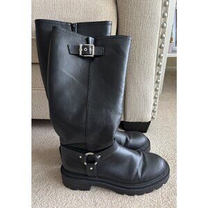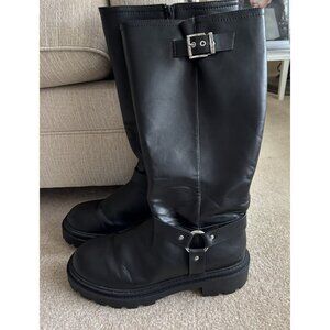 Step out in style with the ASOS New Look biker boots, a blend of edgy design and comfortable wear. These knee-high boots flaunt a sleek black synthetic upper with a buttery leather-look finish that's sure to turn heads. Equipped with a robust adjustable buckle strap and silver-tone hardware, these boots exude a bold, modern vibe, perfect for any casual occasion. With a nod to the trends of the 80s and 90s, these boots feature a chunky sole for a bold silhouette, measuring a comfortable low heel height of 1.5 inches. The round toe ensures ample room for movement, while the extra wide calf fit caters to a comfortable, snug experience. Lined with soft felt fabric and fitted with a durable synthetic insole and outsole, these boots promise to be a versatile addition to your wardrobe.