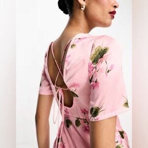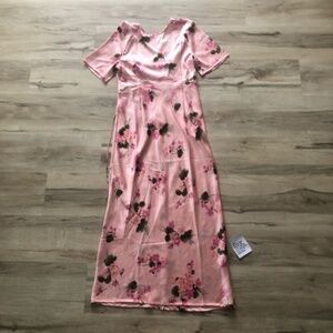 Chic asymmetrical dress with floral pattern. Soft pink fabric. Ideal for stylish outings.