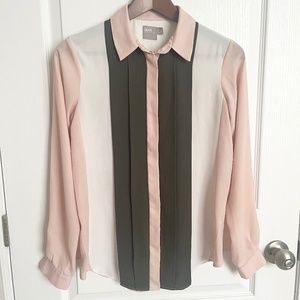 A fun twist on workwear with a colour blocking blouse from ASOS. Two military green panels at the front. Soft pink collar, sleeves, back and front panel covering the buttons. White fabric on the sides and back. The top is not too sheer, and would work well with just a nude bra. Size US4 or small.