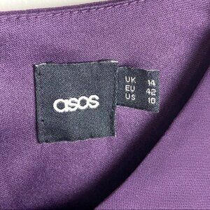 ASOS purple plum sleeveless midi dress - Women’s size 10 - Twist front, faux wrap style - Cinch waist - High round neck - Split back with button closure - Lined - Polyester - Extra Burton still attached Excellent pre-loved condition. No visible flaws.