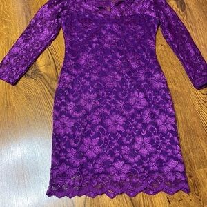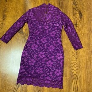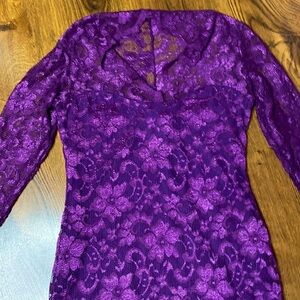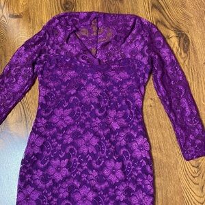 Beautiful purple lace dress in perfect condition. Has some stretch, but made smaller. It is labelled size 6, but I would say it is more of a 4.