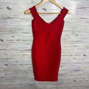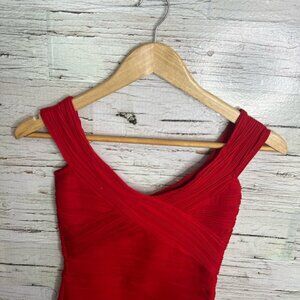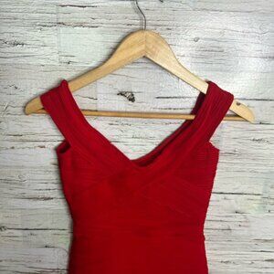 Elegant red midi dress. Features a fitted design. Sleeveless with a V-neckline.