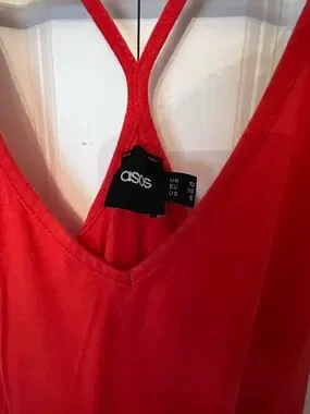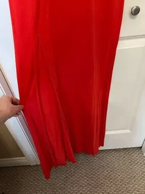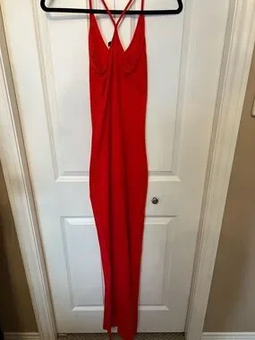 Vibrant red cami dress. V-neck front. Thin straps that cross at the back. Thigh slit.