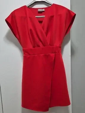 Bold red mini dress with a wrap-front V-neck. Defined waistband for shape. Cap sleeves and a clean, modern cut. Versatile for day or night styling.