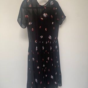 This short sleeve, midi-length dress has a drop waist and pleated skirt. The black patterned dress has a sewn-in black slip.