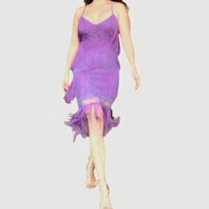 lavender fringe dress, sensual outfit, fun and flirty, flowy style, lace and fringe, evening look, feminine fashion, V-neck elegance, movement in fashion, cross back dress, lightweight and bold, special occasion dress, stylish details, eye-catching outfit, sexy and elegant, playful design