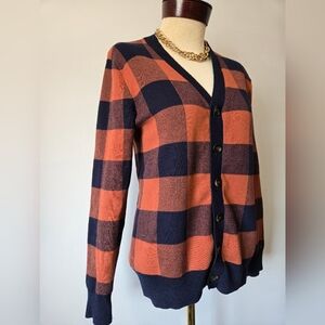 Soft cotton cardigan. V neck with a button up closure. Navy and burnt orange/ brown plaid. Navy ribbed cuffs.