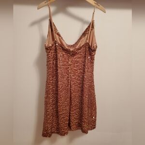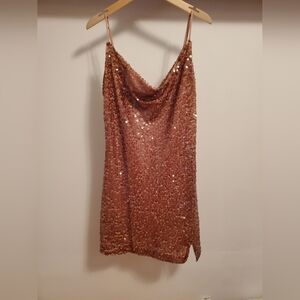 ASTR The Label Sparks Fly sequin mini dress. Cowl neck. Adjustable spaghetti straps. Size XL; see pictures for measurements. Nude (light brown/tan). Zipper in the back. Fabric is a bit stetchy. Lining inside. Missing a few sequins around the back zipper area as seen on pictures. Excellent condition. No stain, no rip. Non smoking house.
