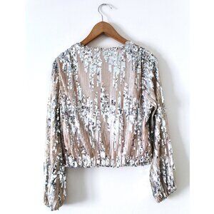 Sparkle and shine bright in the ASTR the Label Primadonna Champagne and Silver Sequin Long Sleeve Top! Sheer woven fabric is adorned with champagne and silver sequins as this shape this stunning top that has a surplice neckline (with a modesty clasp), long balloon sleeves with elasticized cuffs, and a relaxed bodice with a slightly cropped, elasticized hem.