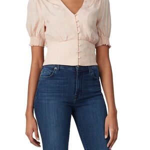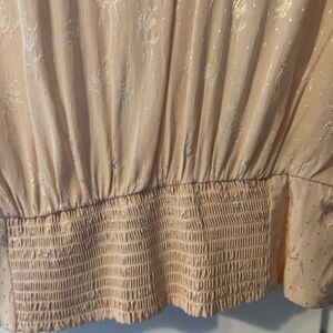 Pretty, prairie chic button up. The style is cropped but it hits right at your waist line. It’s a very pale peachy pink with delicate flower embroidery.
