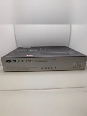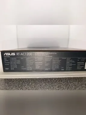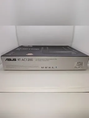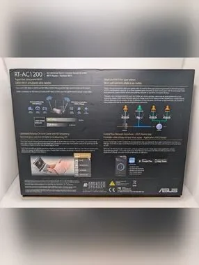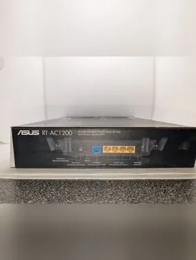 Dual-band wireless router for home networking. Supports 2.4GHz and 5GHz bands. Simple setup and steady connections. Compact design with textured top for airflow. Pre-owned and tested.