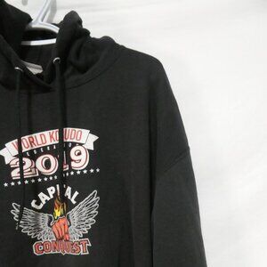 Black hooded sweatshirt featuring bold graphic front print design "World Kobudo Federation 2019 Capital Conquest" front and "World Kobudo" graphic print back