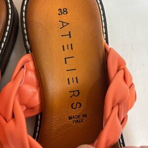 ATELIERS Sz 38 Braided Coral Slides Slip On 2 Strap Sandals Memory Foam. Step out in style with these chic coral braided sandals. Perfect for any casual outing. Stylish sandals that provide a statement and a pop of colour to your outfit. Perfect for a vacation or cruise and for every day use. Made in Italy
